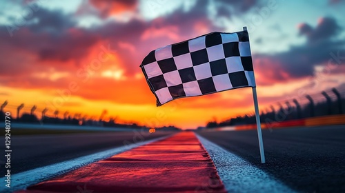 Dynamic checkered flag waving at a race finish line during a vibrant sunset, with dramatic lighting and vivid colors