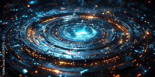 Dynamic circular pattern of glowing blue and orange lights resembling advanced technology design at night