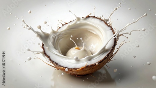 Dynamic Coconut Milk Splash A Visually Stunning Image of Creamy Liquid Bursting from a Halved Coconut Shell, Creating an Enticing Display of Texture and Movement