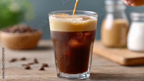 Dynamic cold brew coffee with spinning ice cubes like gears for refreshing summer experience