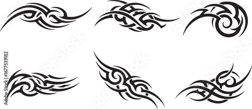 Dynamic collection of abstract tribal tattoo designs, featuring intricate swirling lines, sharp points, and flowing patterns, perfect for body art inspiration or decorative graphic applications