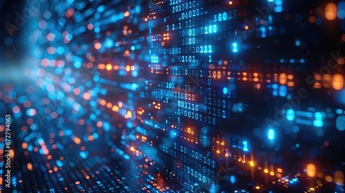 Dynamic digital data visualization with glowing blue and orange particles creating a high-tech background for technology and innovation themes.