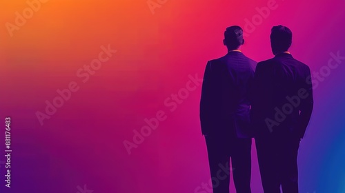 Dynamic Duo: Corporate Executives in Suits Standing in Unity Against Vibrant Gradient Backdrop for Presentation Slides