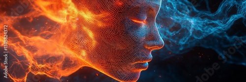 Dynamic fiery-blue wireframe face in abstract digital art