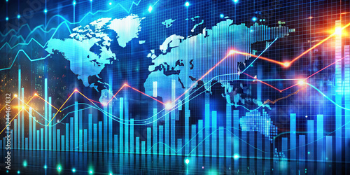 Dynamic financial data is displayed over a world map, highlighting trends and statistics in global markets, showcasing vibrant colors and intricate graphs