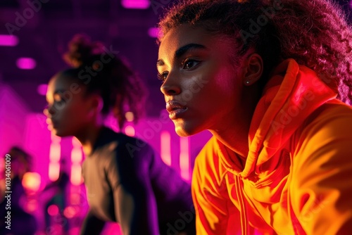 Dynamic focus engaging young athletes training in vibrant urban gym setting with neon lights and intense expressions