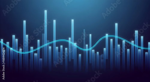 Dynamic glowing blue bar chart with oscillating line, representing financial data and market trends.