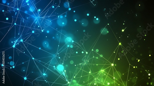 Dynamic glowing green and blue digital points connected by neural network lines.