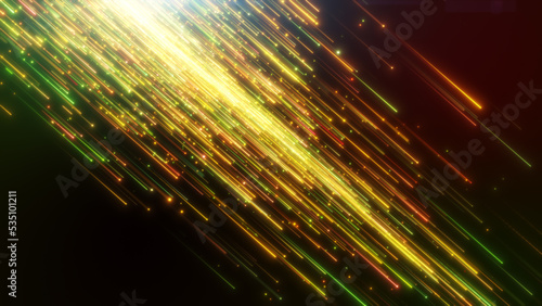 Dynamic glowing line beams, Colorful glow light trail with particles background.