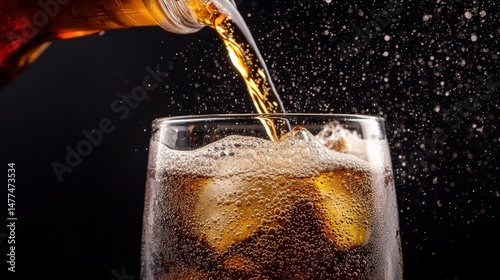 Dynamic High-Speed Shot of Cola Being Poured into a Glass with Ice Cubes and Bubbles