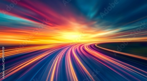 Dynamic highway sunset sky, illuminated road light trail motion, ethereal blurred sunrise fast travel, scenic urban twilight, beautiful colorful modern