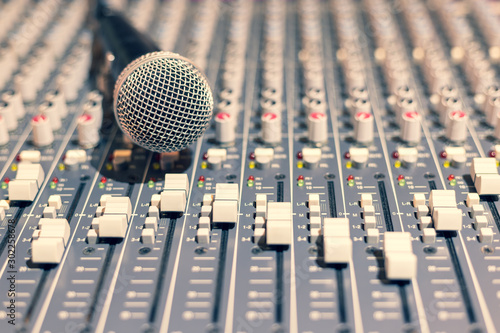 dynamic microphone on audio mixing console. broadcasting, recording concept
