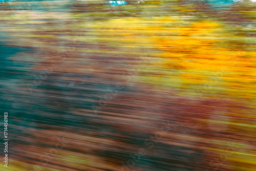 Dynamic motion blur view from high-speed train window: Green landscape, trees & fields rush past at high speed