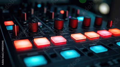 Dynamic movement of crossfader with radiant indicators in a sound studio close-up perspective electronic music environment