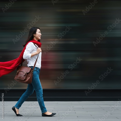 Dynamic Photograph of a Confident Woman Walking with Red Scarf and Leather Bag Against Blurred Urban Background