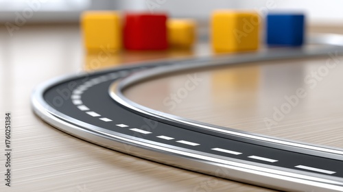 Dynamic play scene with miniature toy cars vehicle on rustic wooden table and another on floor.