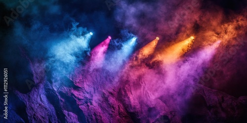 Dynamic plumes of vibrant smoke flowing along a rugged mountain cliff, intersected by concert-grade spotlight beams, fading into a dramatic dark void