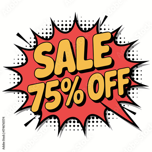 Dynamic Pop Art Sale Announcement with 75% Off Promotion, Bursting Star Effect, Isolated on White, Retail Discount Offer