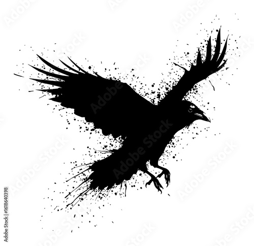 Dynamic Raven Flying Silhouette with Spread Wings in Black and White Drip Splat Abstract Art
