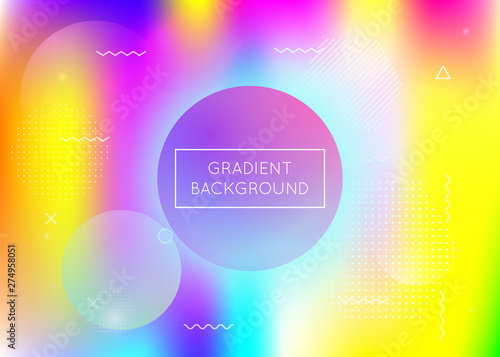 Dynamic shape background with liquid fluid. Holographic bauhaus gradient with memphis elements.