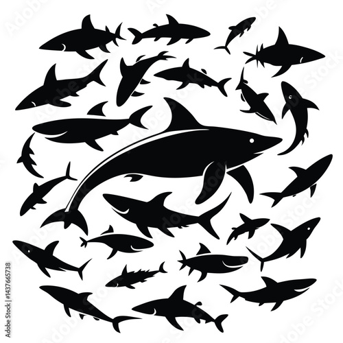 "Dynamic Shark Silhouette Collection Featuring Great White, Hammerhead, and Ocean Wildlife Scenes Vector Illustration"