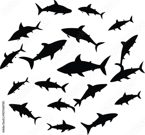 "Dynamic Shark Silhouette Collection Featuring Great White, Hammerhead, and Ocean Wildlife Scenes Vector Illustration"
