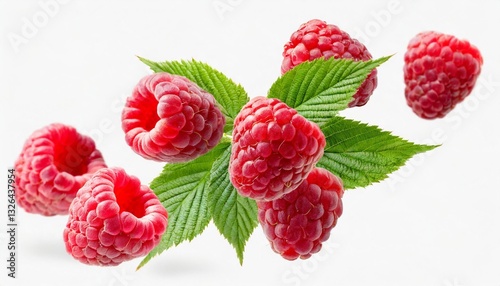 Dynamic Shot of Flying Ripe Juicy Raspberries with Leaves Isolated on White Background