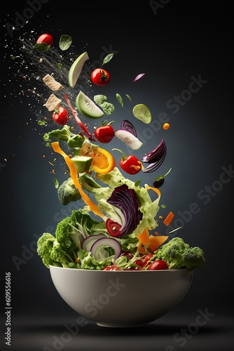 Dynamic shot of fresh salad, vegetables fall into a porcelain bowl. Generative ai.