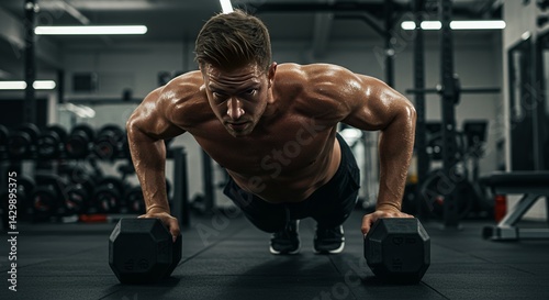Dynamic Shot of Muscular Athlete Performing One-Handed Dumbbell Push-up