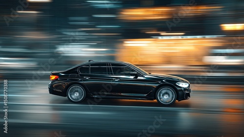 Dynamic side view of a black luxury sedan driving through city streets at night with sleek curves reflecting urban lights and blurred background, symbolizing speed, elegance, and modern lifestyle