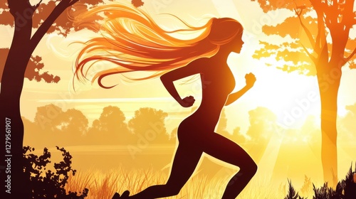 Dynamic Silhouette of Woman Running Against Golden Sunset Background