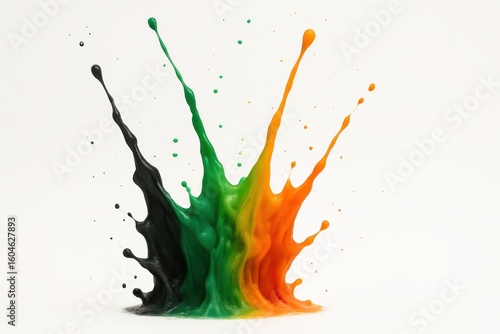 Dynamic splash of black, green, yellow, and orange paint captured mid-air to illustrate color contrast, motion, and design aesthetics