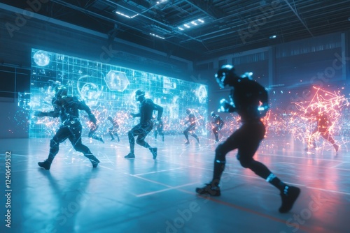 Dynamic sports event featuring advanced gear athletes high-tech arena performance showcase futuristic environment immersive viewpoint holographic displays