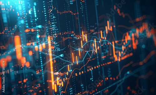 Dynamic Stock Market Charts with Blue Lines and Orange Curves on White LED Screens, Set Against a Dark Blue Background, Featuring Digital Data Visualization and Financial Elements in High-Definition.