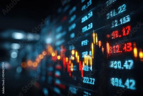 Dynamic stock market data with fluctuating charts and figures displayed on an electronic screen, showing market trends and investment insights in real time.