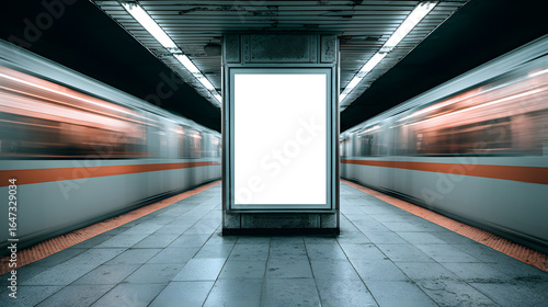 Dynamic subway billboard captures attention with blurred trains creating sense of motion and urban energy
