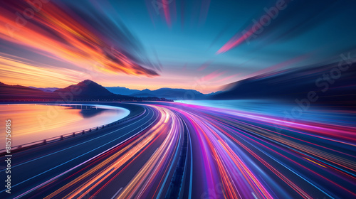 Dynamic Sunset Light Trails on Highway with Mountain Silhouette