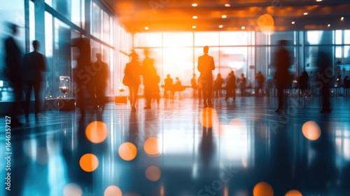 Dynamic Urban Transit: Blurred silhouettes of people traverse a modern, spacious building, a hive of activity, bathed in a warm, sunlit glow, capturing the pulse of the city.