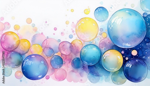 Dynamic Watercolor Bubbles in Shades of Blue, Pink, and Yellow Floating on White Background