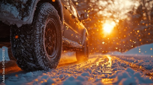 Dynamic Winter Scene of ATV Tires Kicking Up Snow on a Scenic Forest Trail at Golden Hour
