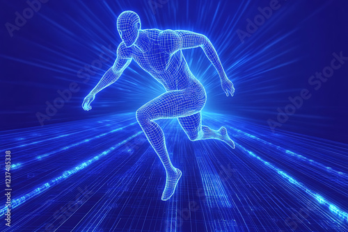 Dynamic wireframe illustration of a sprinter in motion, glowing against a dark background