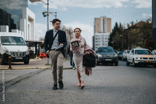 Dynamic young entrepreneurs engaged in a strategic business conversation while walking through the city, planning expansion and profitability.