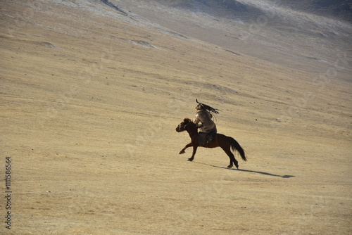 Eagle hunter is galloping to the mountains for hunting with his golden eagle