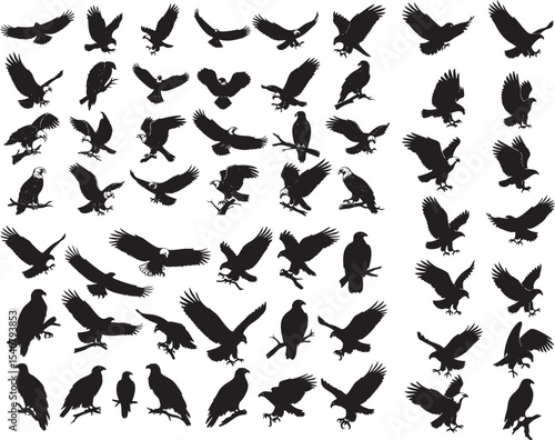 Eagle Silhouette Vector Set. Flying and Perching Birds of Prey. Wilderness and Freedom Animal Graphic Collection.