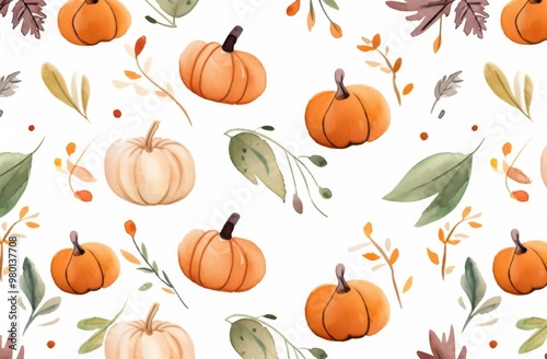 eamless Watercolor Pumpkin Pattern: Enchanting Fall Design with Warm Oranges, Soft Browns, and Gentle Greens Against a White Background.