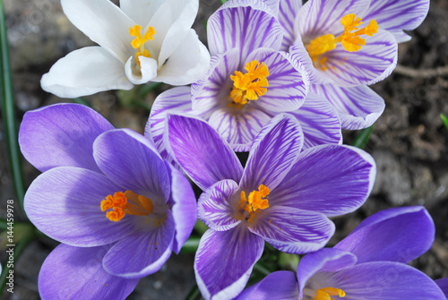 Early crocuses in spring blooms in flower garden
