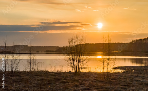 Early spring. Beautiful sunset on the wild nature. Forest river