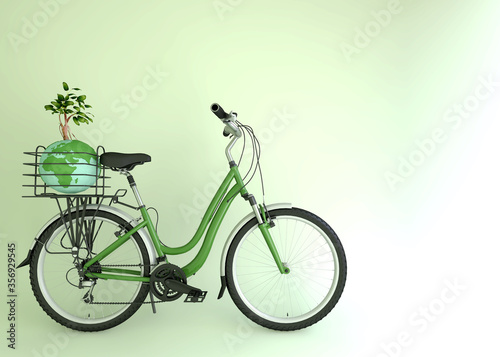 Earth and plant in Bicycle basket, Concept image for world environment and sustainable living, 3D illustration with copy space.