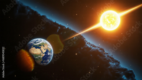 Earth and Sun in Space with a Powerful Energy Beam and Nebulous Clouds planet solar system