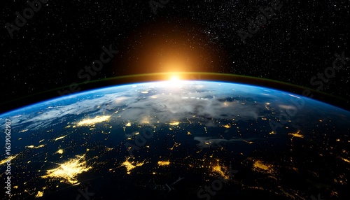 Earth at Sunrise: City Lights Illuminate the Night, Seen from Space with Starry Background